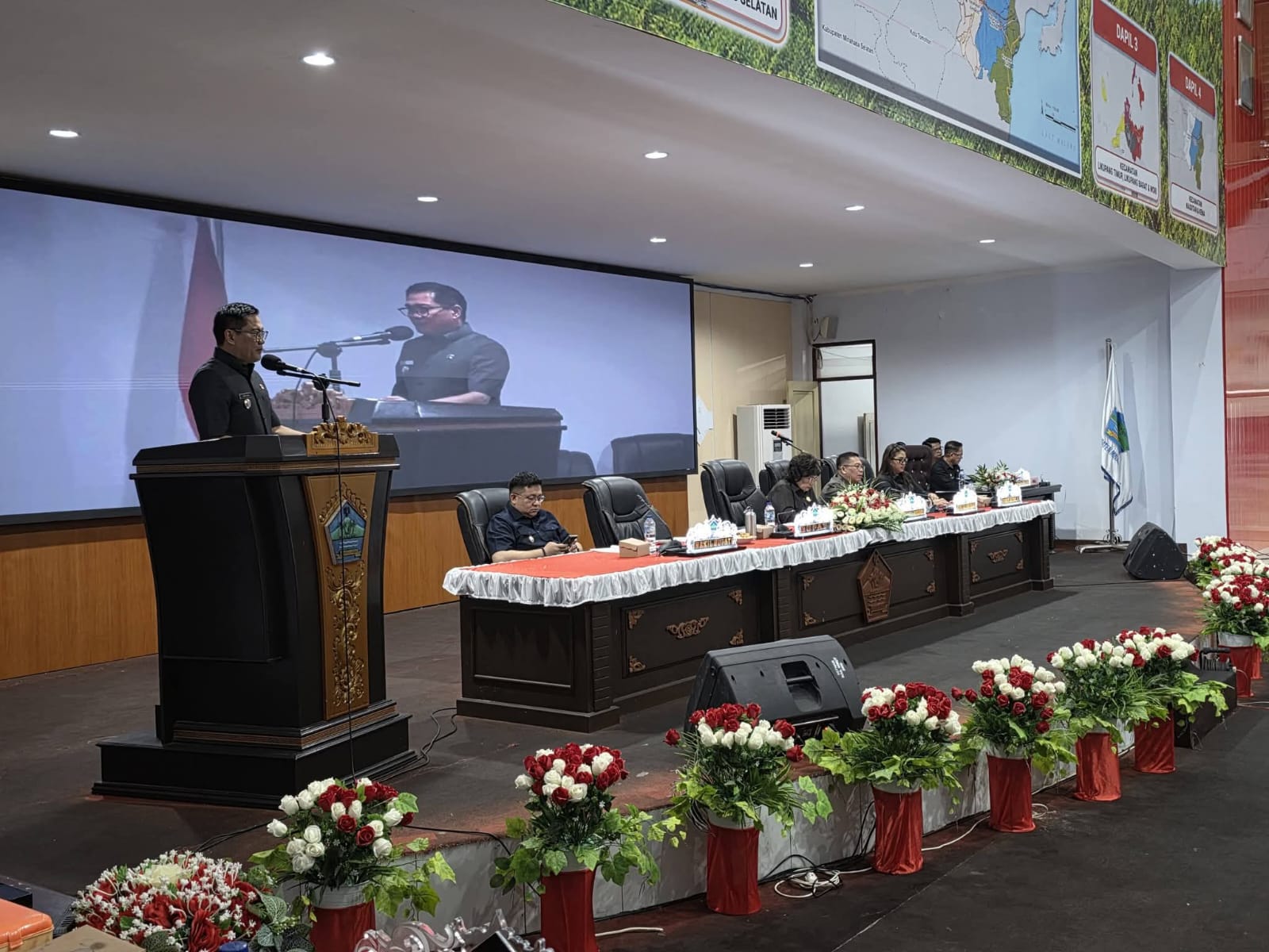 Bupati Joune Ganda dalam sambutannya menyampaikan rasa syukur atas terselenggaranya rapat paripurna ini dan menegaskan bahwa seluruh proses pembahasan rekomendasi DPRD terhadap LKPJ Tahun Anggaran 2025 merupakan bagian penting dalam mewujudkan tata kelola pemerintahan yang baik, transparan, dan akuntabel.