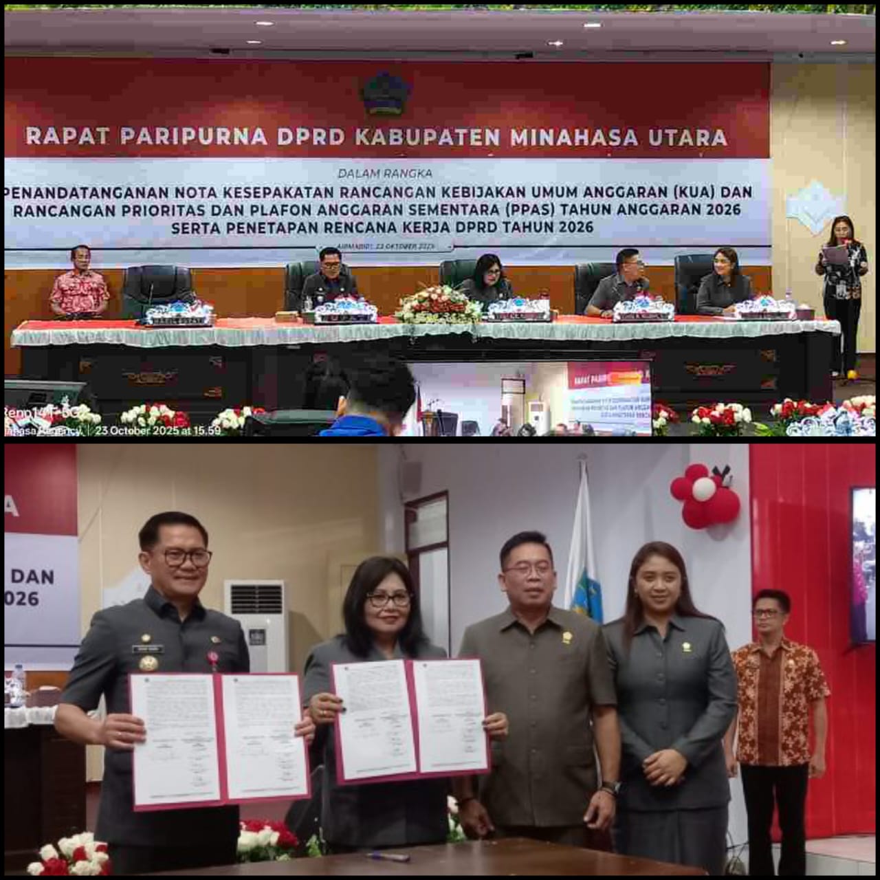 Global1news.com, MINUT — Dewan Perwakilan Rakyat Daerah (DPRD) Kabupaten Minahasa Utara (Minut) menggelar Rapat Paripurna penandatanganan nota kesepakatan rancangan Kebijakan Umum Anggaran (KUA) dan rancangan Prioritas Plafon Anggaran Sementara (PPAS) tahun anggaran 2026, di Kantor DPRD Minut, Kamis (23/10/2025).
